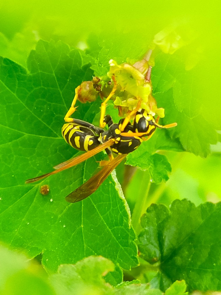 Pour ce joli moi de mai, j’aurais pu vous présenter un brin de muguet, mais en me promenant dans le jardin, je suis tombée sur cette petite guêpe en plein milieu des groseillers.