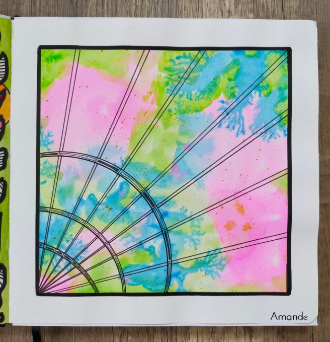 Pour le fond j’ai testé une fusion de couleur, en ajoutant quelques traits, je l’ai laissé en suspens car j’avais peur de trop alourdir la page en rajoutant des dessins au crayon noir.