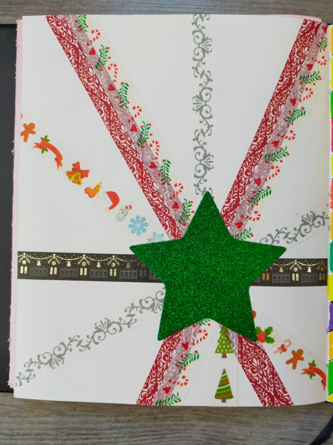 Cette page est très facile et très rapide à réaliser. Je l’ai faite sur le thème de Noël, mais elle peut très bien se réaliser tout au long de l’année en variant les couleurs et les thèmes des masking tape.