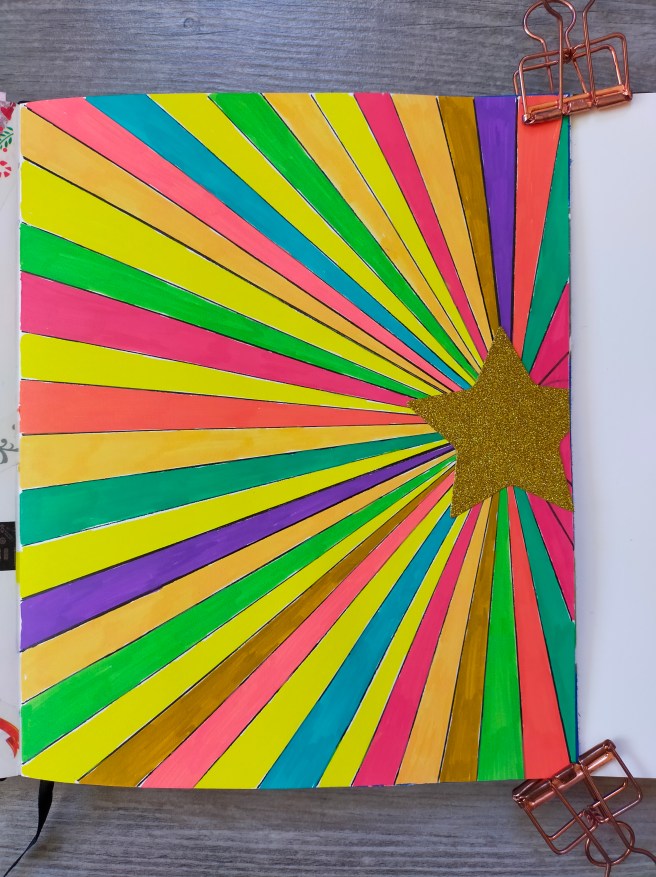J’ai d’abord, fait pleins de lignes qui se touchaient en un point central (caché derrière l’étoile), puis je les ai coloré avec des feutres acryliques, et pour finir j’ai collé une étoile en papier pour cacher le centre.